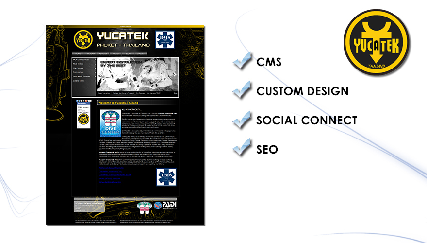 One of very latest websites, Yucatek Thailand and DMS reflects the cutting-edge in graphic design. This one-of-a-kind dive center (they even have their very own hyperbaric chamber!) required a one-of-a-kind graphic design. Hammerhead Technologies were very happy to meet their high standards.
