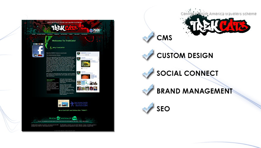 TrekCats is an organization representing dive centers and reputable tourism operators across Central and Latin America. Hammerhead Technologies were tasked to supply a robust yet intuitive CMS solution to help represent this exciting adventurous brand. The smart modern artwork was provided by TrekCats. The website connects mutiple agencies together throughout the southern Americas.