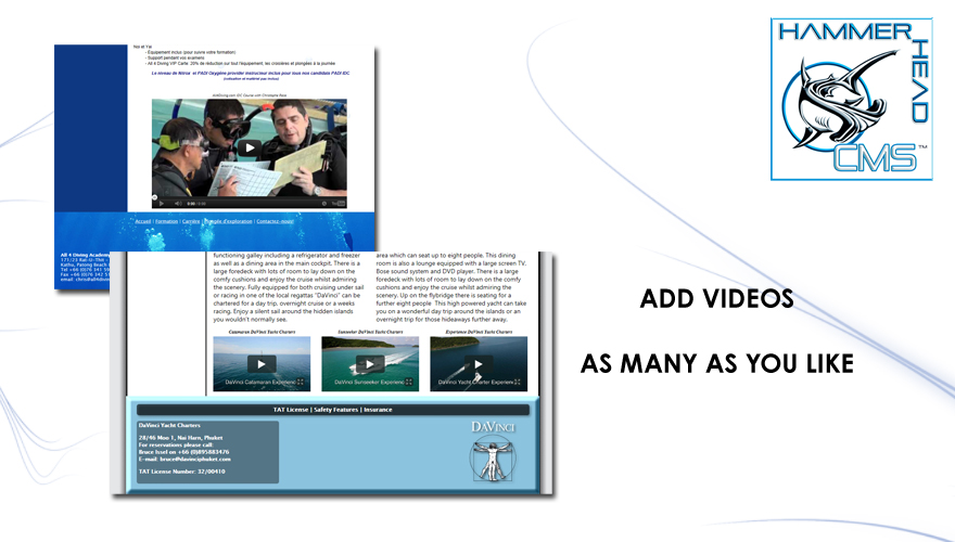 With embedded videos there is no delay in the way they load. Using market leaders such as YouTube, Vimeo, etc. you can share the fun and excitment of your company without worrying that the customer will abandon the page long after it starts to load. With simple embed codes provided by these 3rd parties you just copy & paste them into the CMS, and view them on your website pages, items or articles.